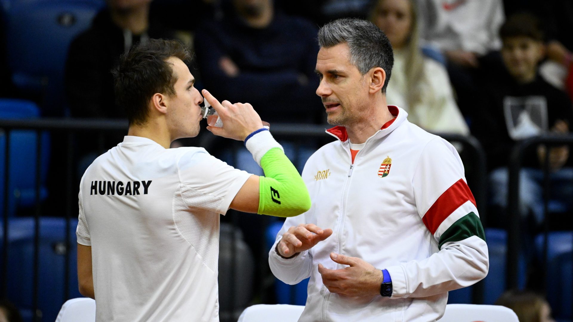 Tatabánya, 2026. február 7. Bardóczky Kornél, a magyar férfi teniszválogatott szövetségi kapitánya (j) és Piros Zsombor a tenisz Davis-kupa Magyarország-Egyesült Államok selejtező mérkőzésén Tatabányán 2026. február 7-én. MTI/Bodnár BoglárkaÖt gém után, 3:2-nél Piros ápolást kért a combhajlító izmára, ezzel együtt nem tűnt sérültnek a továbbiakban, magabiztosan hozta a szerváit, közben a mindig baseballsapkában játszó rivális feltűnően sokat rontott a túloldalon. Így jutottak el a rövidítésig, melyben 2-2 után a magyar játékos már csak egy pontot hozott össze, így 70 perc után az egyre türelmesebben ütő amerikai került szettelőnybe.