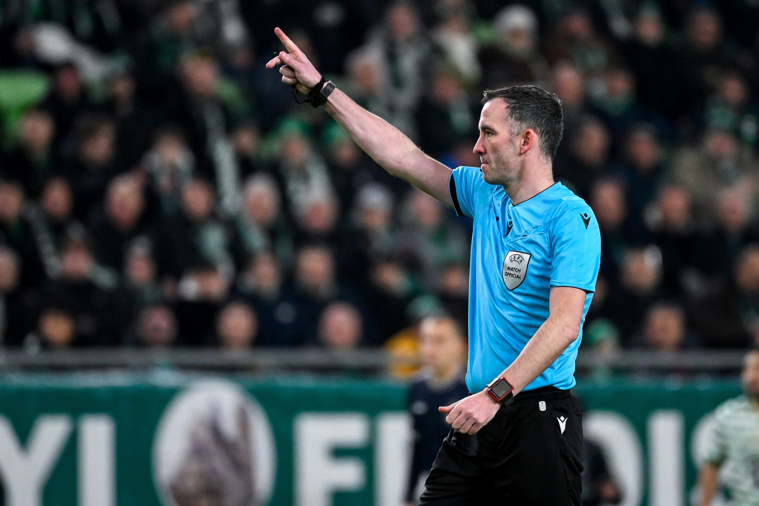 A brit Chris Kavanagh játékvezetõ (k) a labdarúgó Európa-liga nyolcaddöntõjébe jutásért játszott Ferencvárosi TC - PFK Ludogorec Razgrad visszavágó mérkõzésen a Groupama Arénában 2026. február 26-án. A Ferencváros 2-0-ra gyõzött és így 3-2-es összesítéssel továbbjutott a nyolcaddöntõbe.