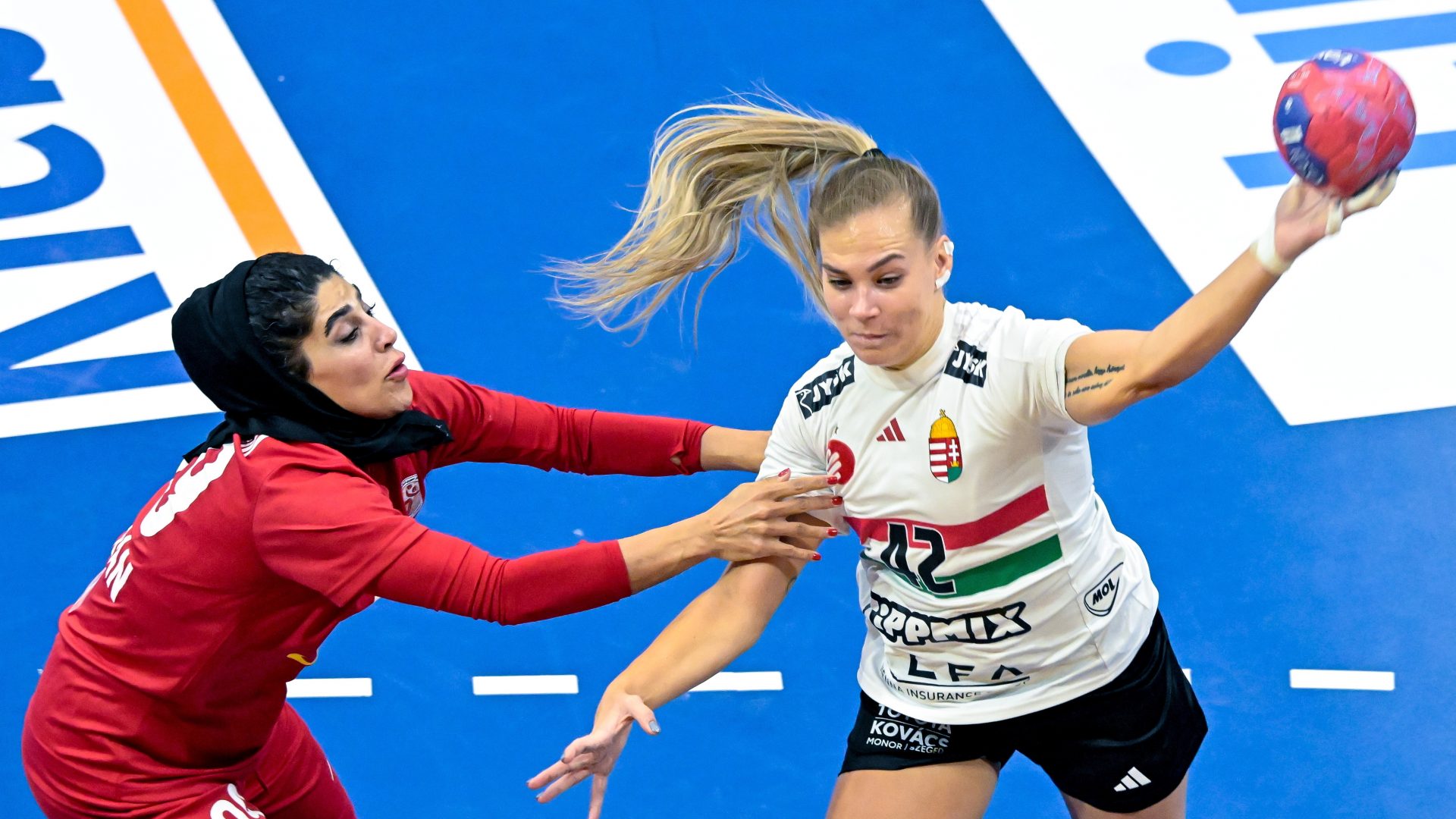 ’s-Hertogenbosch, 2025. november 29. Klujber Katrin és az iráni Mozhgan Gahremani a holland-német közös rendezésű női kézilabda-világbajnokság B csoportjának 2. fordulójában játszott Irán – Magyarország mérkőzésen a hollandiai 's-Hertogenboschban 2025. november 29-én. A magyar válogatott 47-13-re győzött, ezzel középdöntőbe jutott. MTI/Szigetváry ZsoltSorra érkeztek a gyors magyar gólok lerohanásból vagy felállt védőfal ellen, és a rontott lövések után is megharcoltak a kipattanókért a magyar játékosok, ennek eredményeként még a szünet előtt húsz találatra duzzadt az előny (26-6). A hangulatot a nézőtérről a magyar szurkolók biztosították szüntelenül, hozzájuk alkalmanként csatlakozott csak néhány kolomppal felszerelt holland és svájci drukker. A nézőtéren feltűnt Gyulay Zsolt, a Magyar Olimpiai Bizottság (MOB) elnöke és Fábián László, a MOB főtitkára is.