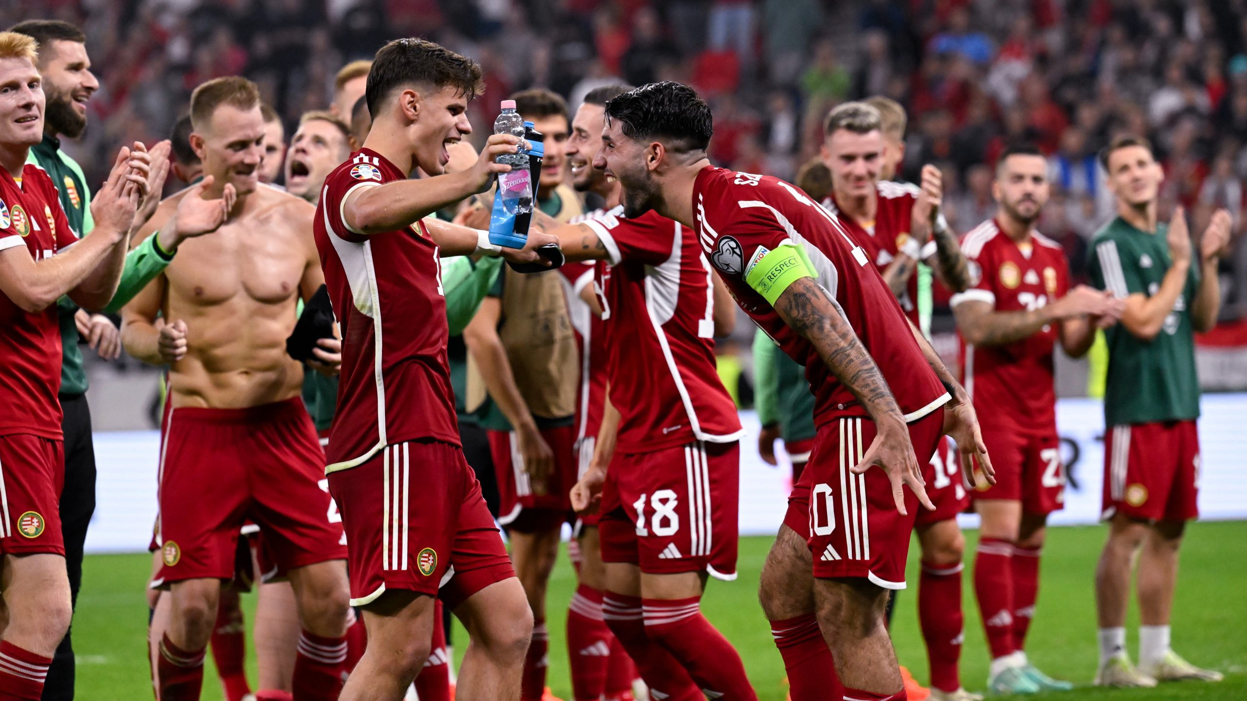 A magyar válogatott ünnepel a szerbek ellen 2–1-re megnyert hazai Eb-selejtező után (Fotó: MTI/Kovács Tamás)