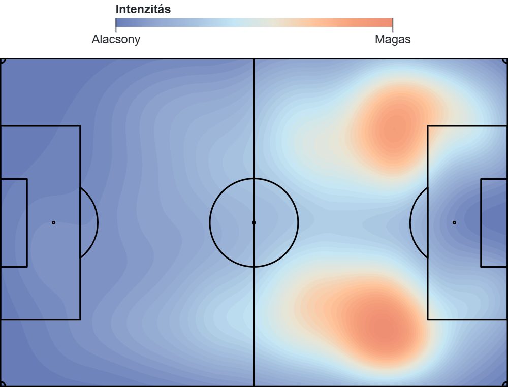 A PPDA önmagában nem mutatja meg a letámadás sikerességét – például úgy is lehet alacsony az érték, ha az ellenfél felívelgeti a labdákat, mert így szeret építkezni, de zónalefedettség és a labdaszerzések helyszíne is számít –, a Cube „magas presszingre” vonatkozó pizzaszelete azonban egy aggregált, különböző elemekből (PPDA, magasan megszerzett labdák, védelmi vonal magassága) összeállított mutató, így ezt is megvizsgáltuk: