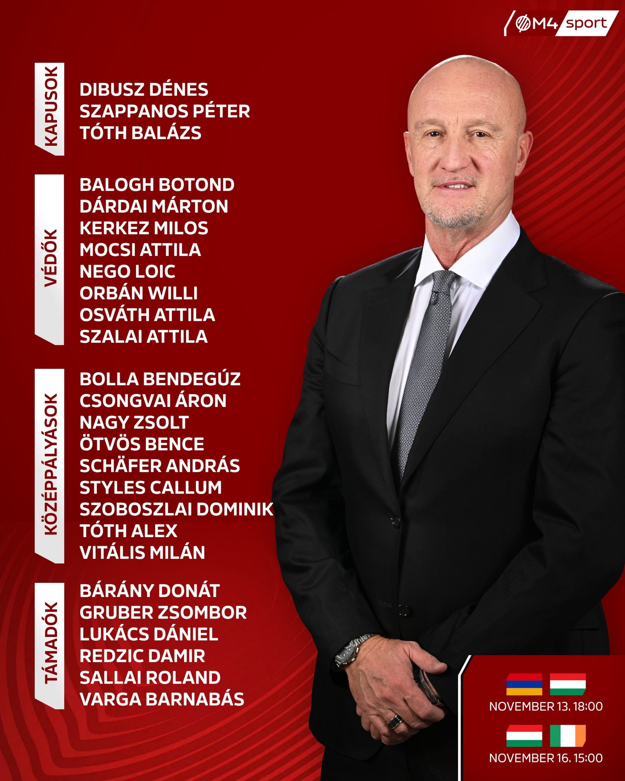 A válogatott összes mérkőzését, így az örmények elleni idegenbeli és az írek elleni hazai meccset is élőben közvetíti az M4 Sport és az m4sport.hu!