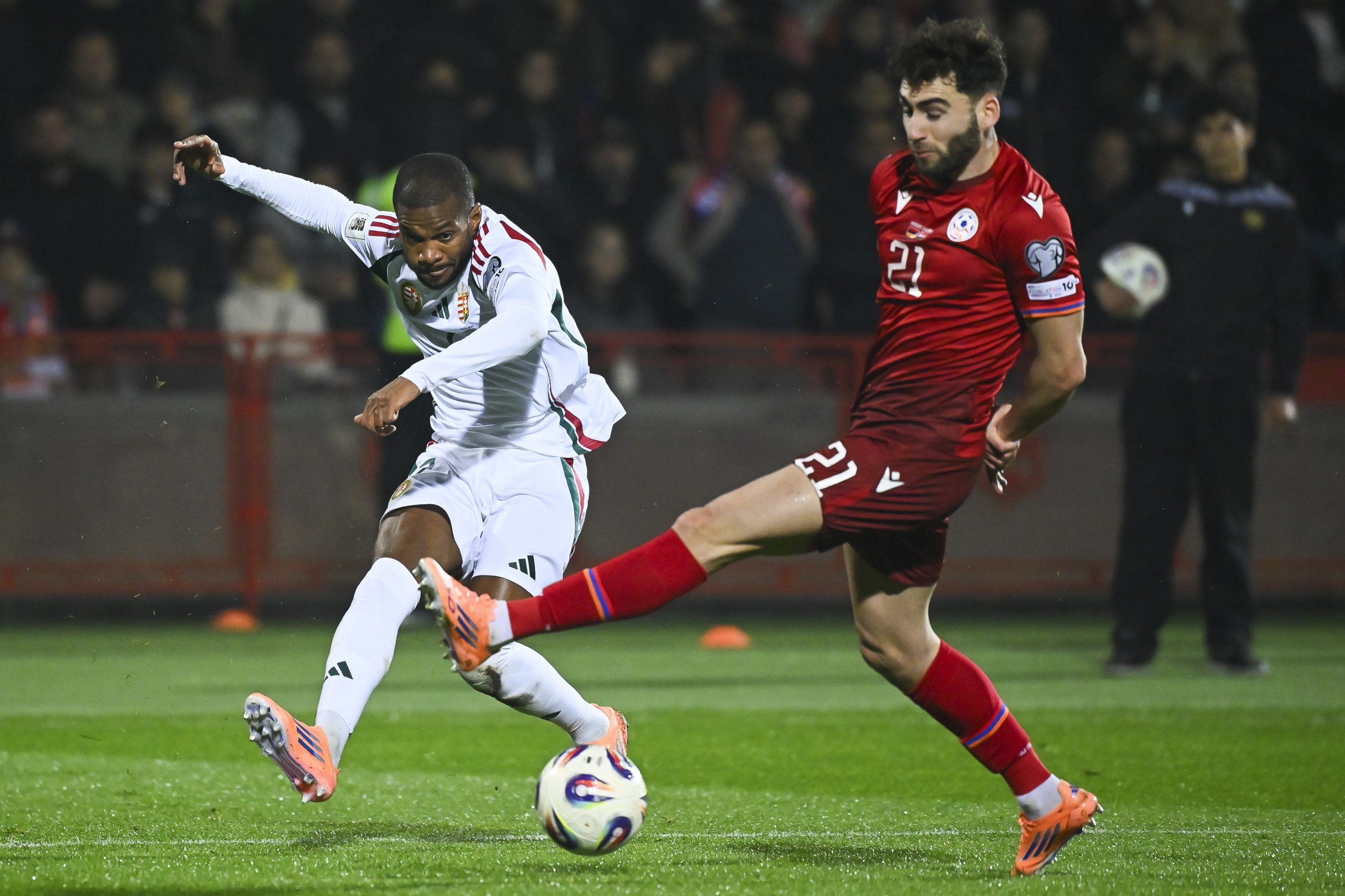 Loic Négo (b) és az örmény Nair Tiknizjan az Örményország - Magyarország labdarúgó világbajnoki selejtezõ mérkõzésen a jereváni Szargszján Köztársasági Stadionban 2025. november 13-án.