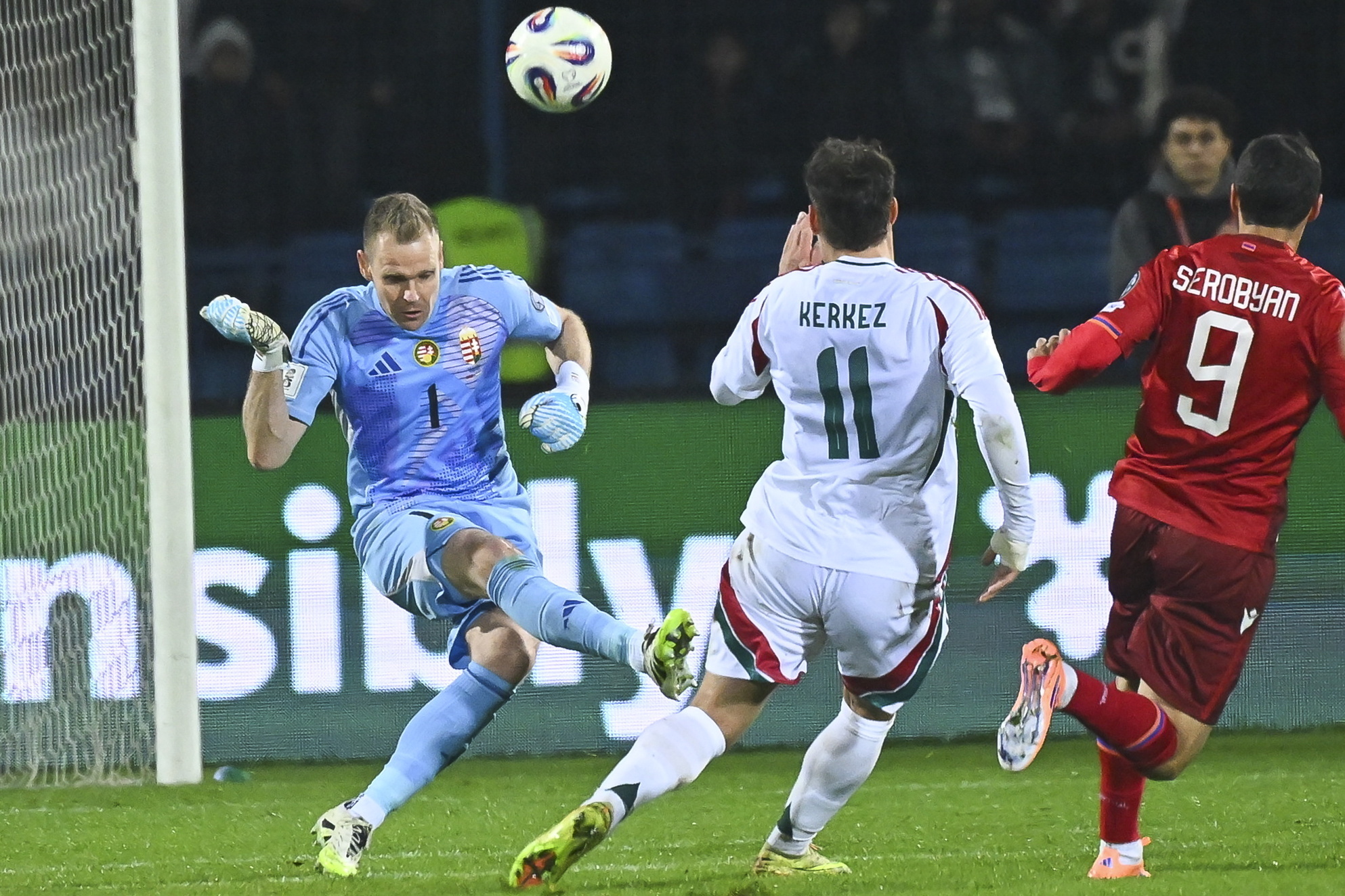 Dibusz Dénes kapus (b) az Örményország - Magyarország labdarúgó világbajnoki selejtezõ mérkõzésen a jereváni Szargszján Köztársasági Stadionban 2025. november 13-án. A magyar válogatott 1-0-ra nyert.