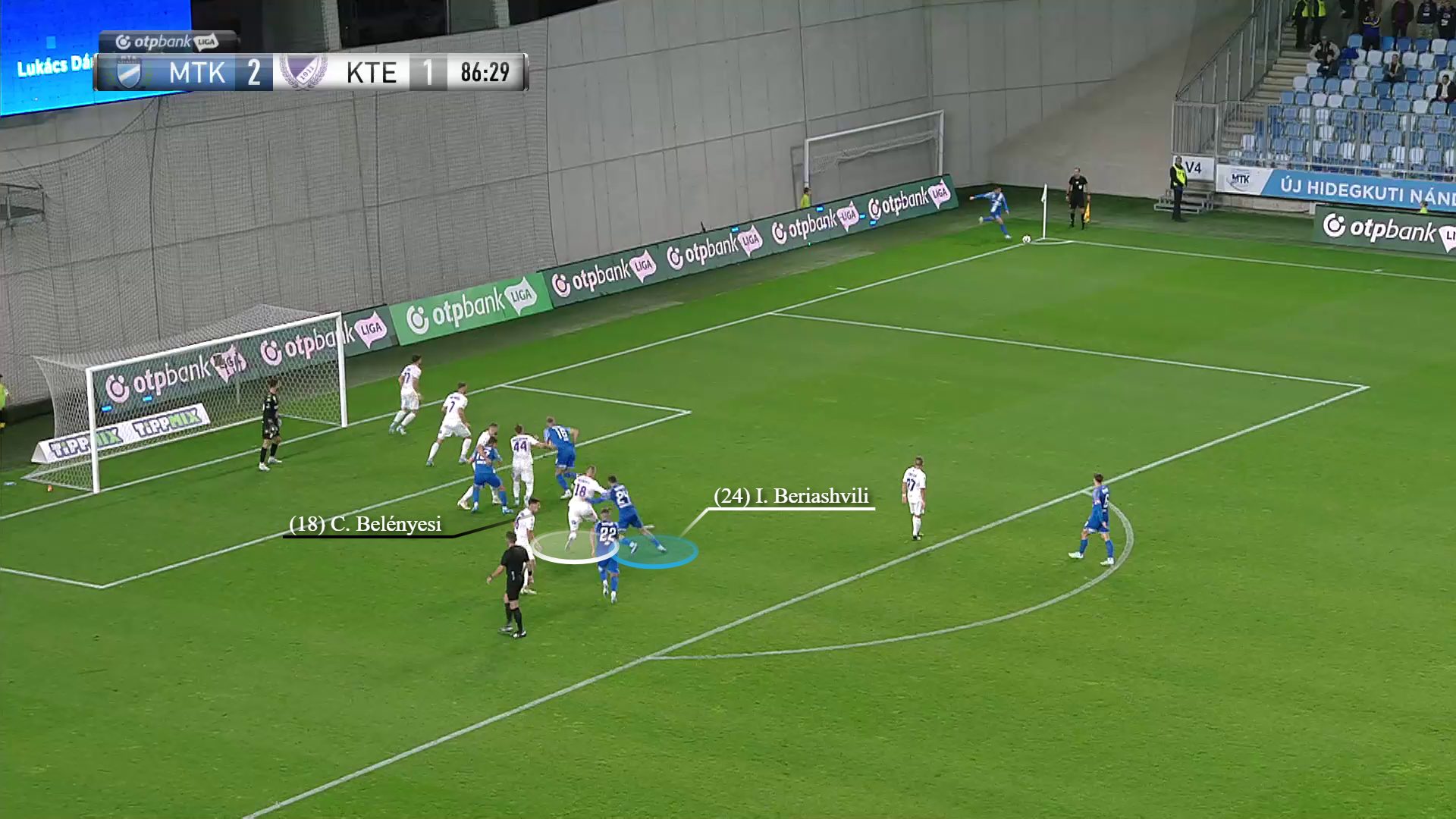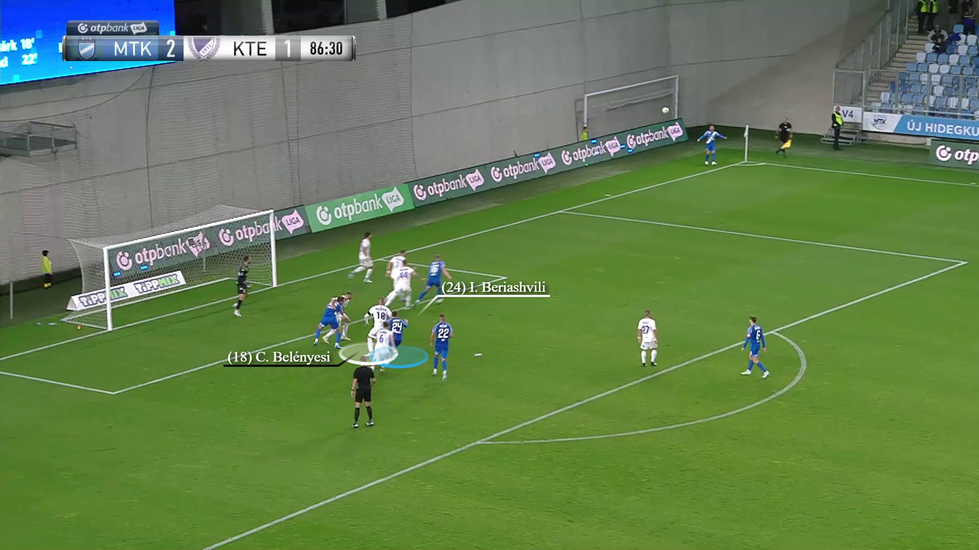 Mire Belényesi ezt konstatálta, Beriashvili zavartalanul betört a szabad területre, ahonnan könnyedén befejelte az MTK harmadik gólját.